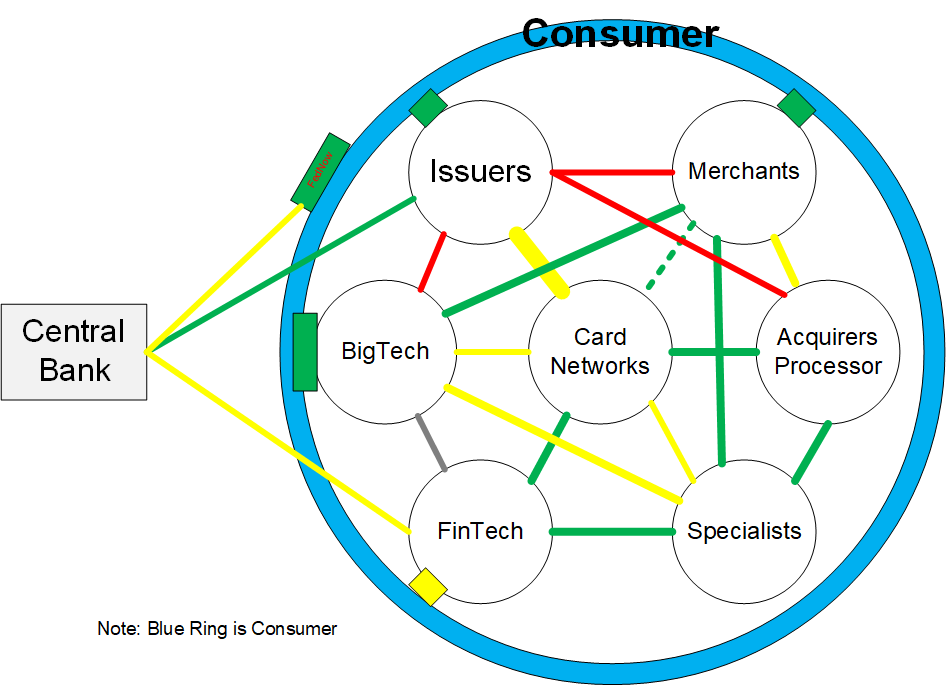 - Large entities operate at superior economics (see blog) and have a vested interest in maintaining the status quo (Issuers and Merchants)